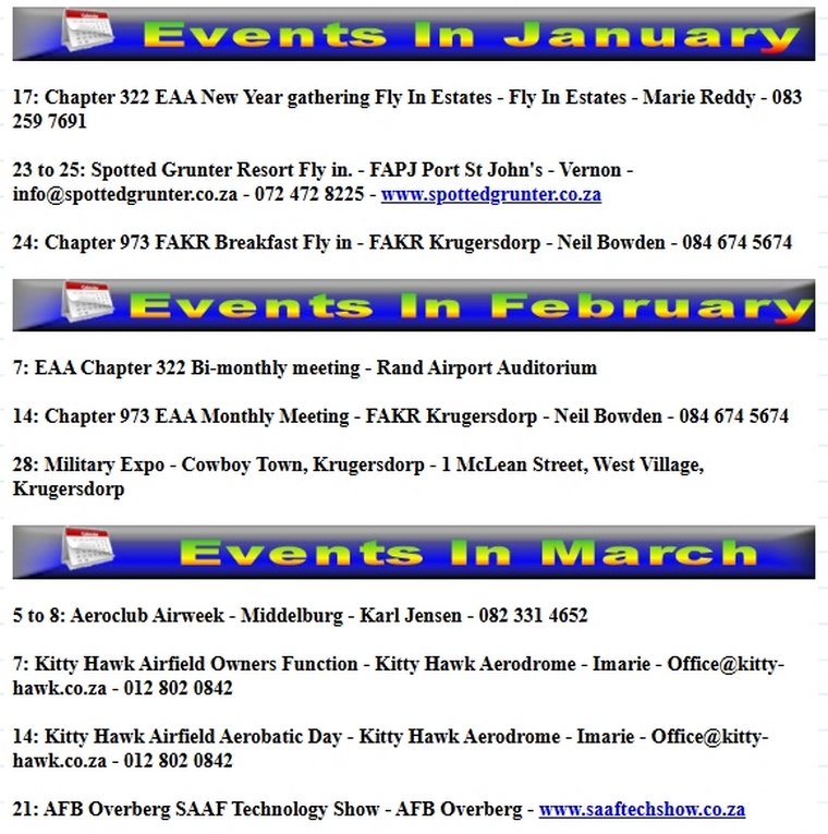 With the flying season now officially open, the following EAA events are planned for the next three months; a promising start to what looks set to be another exciting year for South Africa's homebuilt and recreational aviation community.