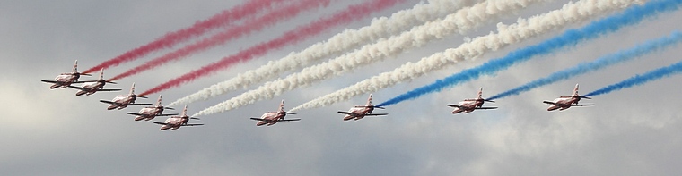 At the very end of the show the clouds parted and the sun appeared, allowing the Red Arrows to show why they are regarded as one of the world's best display teams. For the first half of the show the crowd were wowed by 9-ship formations before they split into the 5-ship Enid and 4-plane Gypo.