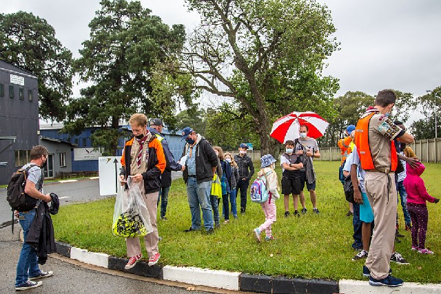Cubs, Scouts and Rovers forming up and getting organized for the day's visits as the rain starts falling. Officials and Rovers get hi-viz vests to "be prepared".